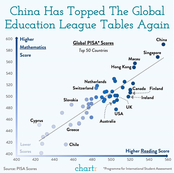 Interesante cuadro que publica hoy @Gauyo sobre los resultados de las pruebas Pisa en China. Para los que creen que su diferencial competitivo son sus salarios (que ya no son tan bajos como en el pasado) [Imagen]