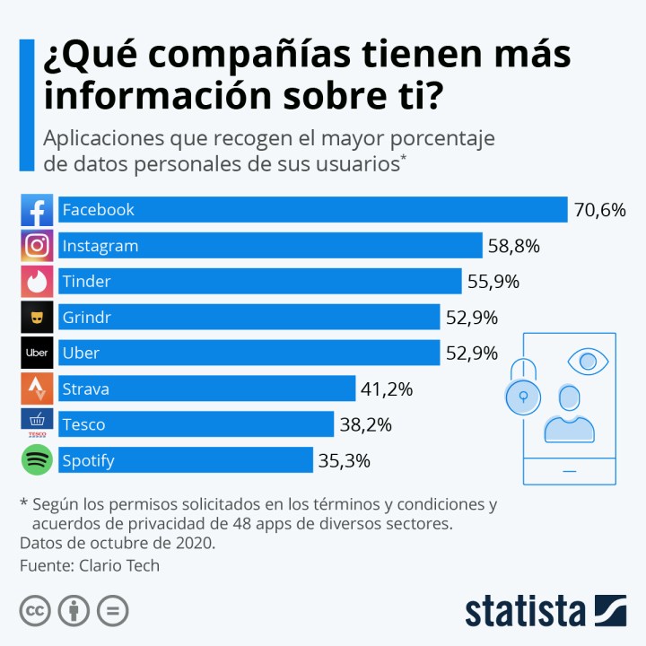 Qué servicios tiene más información sobre vos. Lo de Facebook no sorprende. Notable que Uber tenga tantos datos tuyos como una aplicación de citas [Statista]