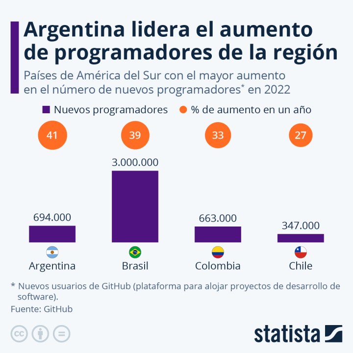 Según un informe de GitHub, Argentina fue el país de Sudamérica que tuvo el mayor incremento (41%) en el número de nuevos programadores en 2022, en comparación con el año anterior. [Statista]